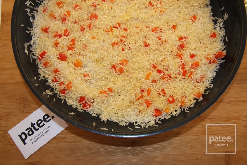Засыпаем рис и перемешиваем с перчиком. Распределяем равномерно по дну и следим, чтобы рис был не выше 2 см.