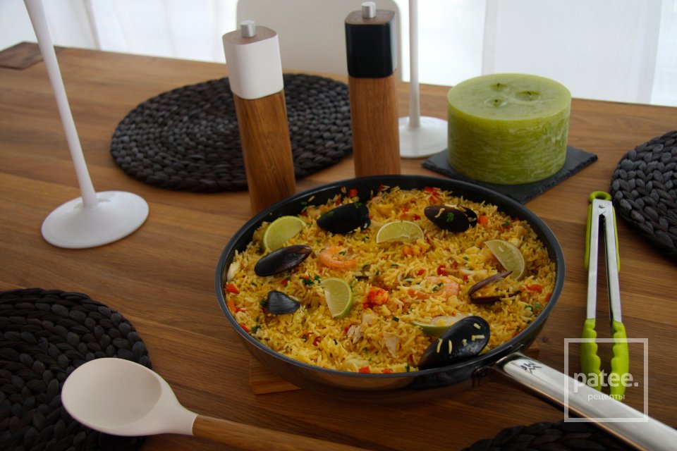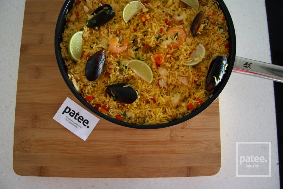 – — Если хотите следовать всем испанским традициям, связанным с этим блюдом, то все морепродукты стоит выкладывать только после того, как блюдо будет готово, в качестве вкусного украшения.