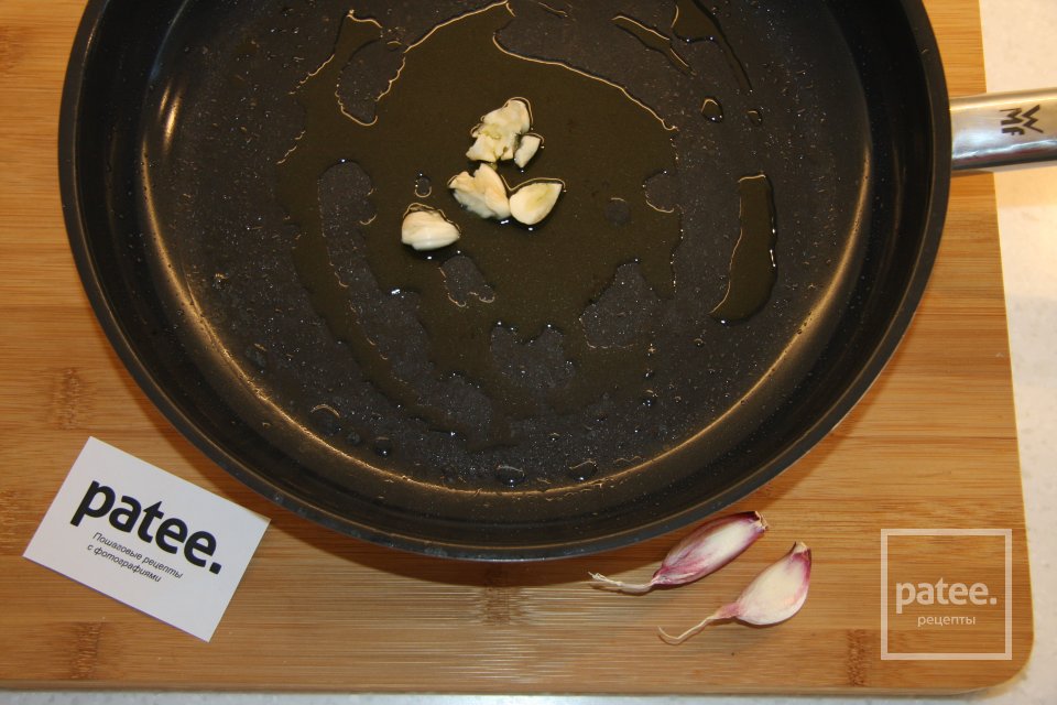 Налейте оливковое масло в холодную сковородку и добавьте 2 зубчика чеснока, раздавленных плоскостью ножа. Поставьте на огонь.