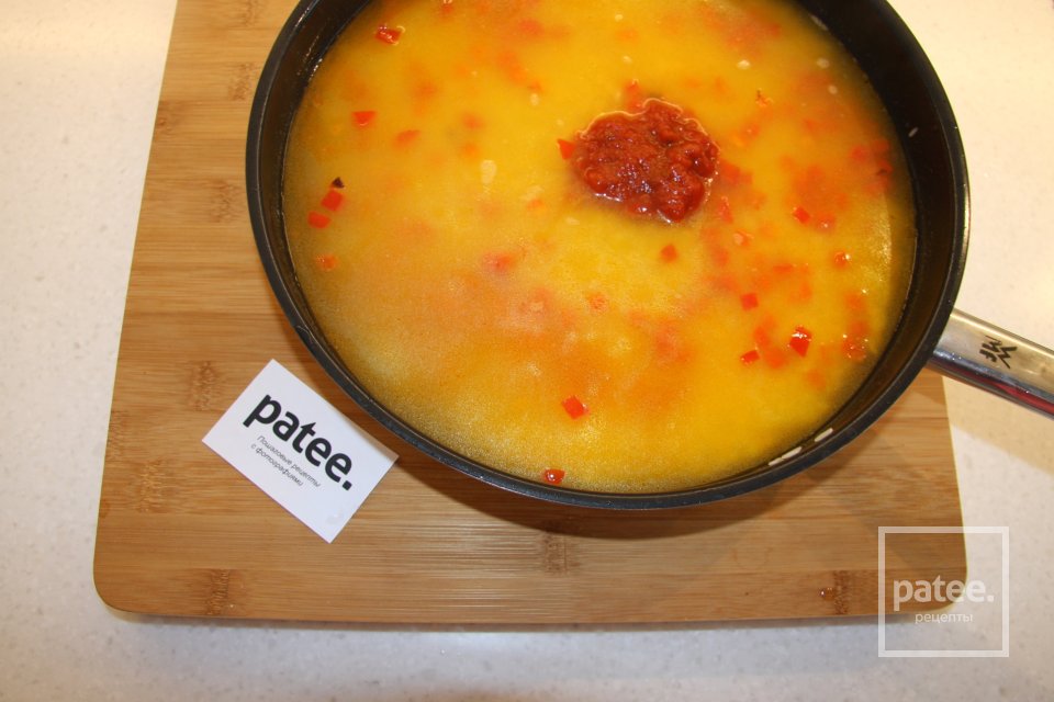 Перемешиваем бульон с 2-мя ложками томатной мякоти, ставим на огонь и даем закипеть.