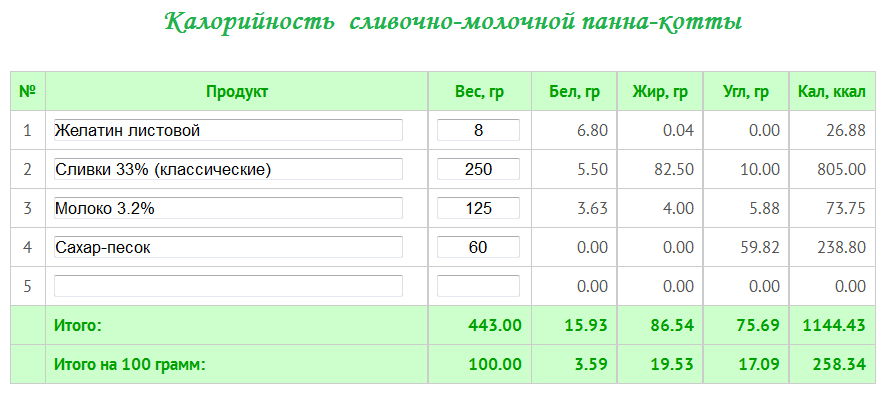 Калорийность молочно-сливочной панна-котты без учета соуса и ванильной составляющей в таблице на картинке.