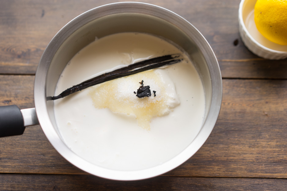 Если у вас дома окажется ванильный стручок – можете использовать и его, предварительно вычистив из него мякоть, которую и следует добавить к сливкам. Помешивая сливочную смесь хорошо нагреть (не доводя до кипения).