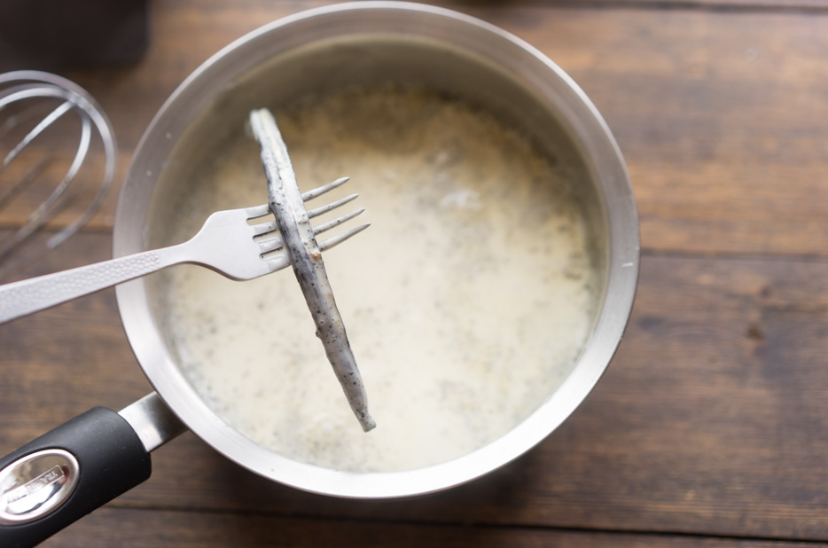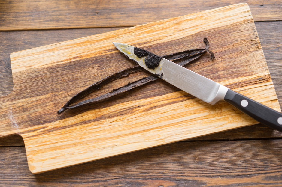 - Разрежьте стручок ванили вдоль на две части. Тыльной, не заточенной, стороной ножа соскоблите семена ванили со стенок стручка.