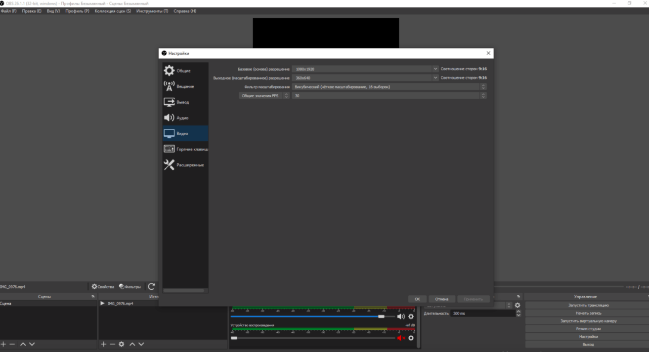 После создания проекта в программе необходимо провести ее настройки. Для этого установить разрешение, лучше использовать 1080×1920, а соотношение сторон выбрать 9 к 16. Что касается битрейта, то нужно ориентироваться на скорость канала интернета, более 6000 выбирать не стоит, в этом нет никакого смысла, а вот минимальный должен быть не менее 4000.