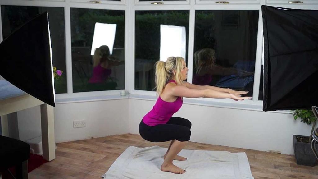 - Делаем приседания, для чего вначале становимся прямо, расставив ноги на ширине плеч, а руки оставляя висящими по бокам. Затем делаем присед, следя, чтобы бедра оказались параллельными полу, замираем так на пару секунд и возвращаемся в исходное положение. Повторяем так около 10 раз.
