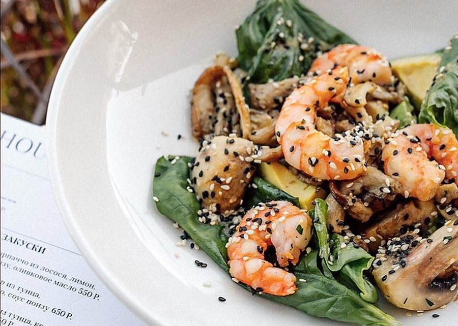 Шпинат выложить на тарелку. Авокадо почистить, крупно нарубить, выложить туда же, сверху – теплые креветки с грибами, полить все соусом и посыпать кунжутом.