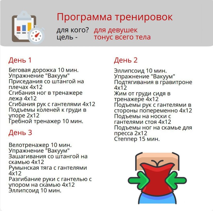 Ничего страшного, если у вас не получается полностью соблюдать эту программу. Однако помните, что необходимо подобрать похожие упражнения в тренажерном зале для девушек, выполняя их в таком же количестве подходов и повторений, и работать с умеренным/тяжёлым весом, тогда у вас будет прекрасная физическая форма и фигура. Упражнения с использованием штанги и гантелей не испортят вашей фигуры, это может сделать лишь неправильное питание!