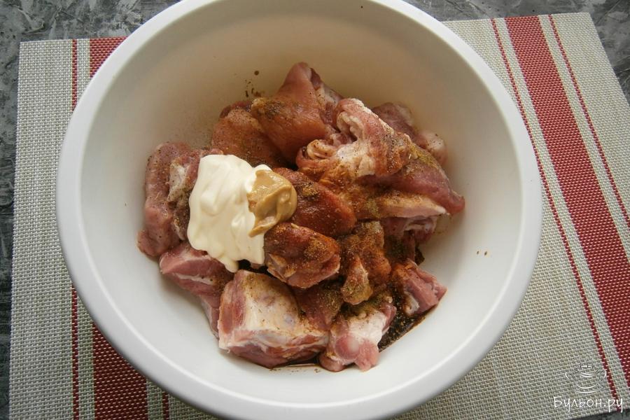 - Затем посолим и добавим приправу для мяса. Специи можно брать любые — по своему вкусу.