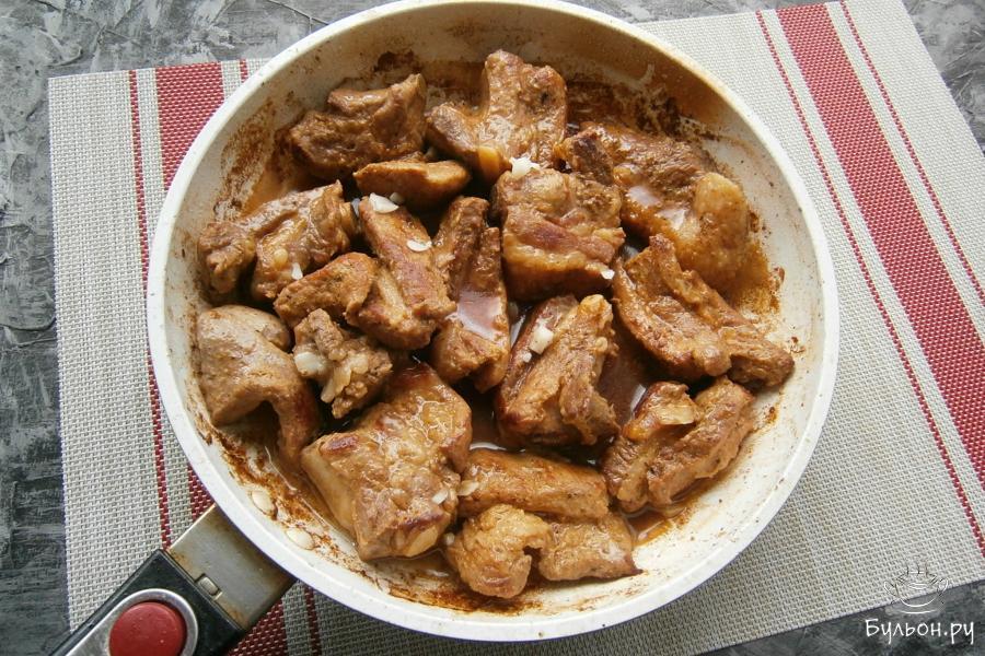 - Количество масла при обжаривании регулируют на своё усмотрение, в зависимости от жирности свинины. Налив его слоем в сковороду, разогревают, выкладывают рёбра и обжаривают до яркого румянца на сильном огне. Далее нагрев уменьшают до минимального, всё так же перемешивая, готовят ещё четверть часа.