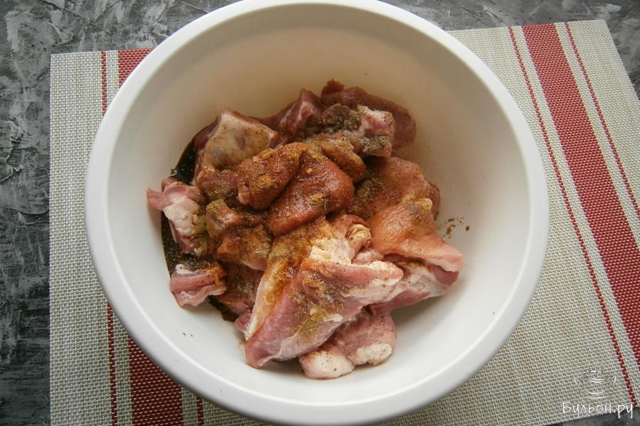 Порезанное мясо выложить в миску, присыпать специями, посолить, перемешать и оставить буквально на 30 минут. Затем обжарить на сковороде в масле до появления золотистой корочки.