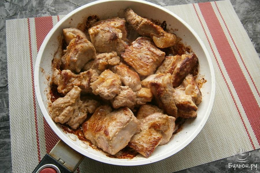 - В сковороду нальем немного растительного масла, нагреем и обжарим ребрышки на сильном огне до румяности. Благодаря такой обжарке все соки запечатаются внутри мяса, и оно останется сочным. Количество масла должно зависеть от жирности мяса. Возможно, масло вовсе не понадобится, если вы будете готовить из ребер с большой прослойкой жира.