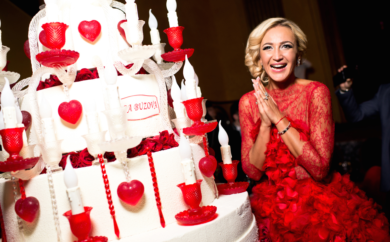 Для ведущей Ольги Бузовой. Лампы же, украшавшие торт, были выдувными, из карамели.Мастер работал над такой технологией, чтобы карамель могла сжиматься и разжиматься.Никто в мире такого не делал еще. Это стало настоящим сюрпризом для теледивы, ведь она не видела даже эскиза. Единственным ее желанием было соблюдение бело-красной гаммы, что умело и выполнил кондитер.