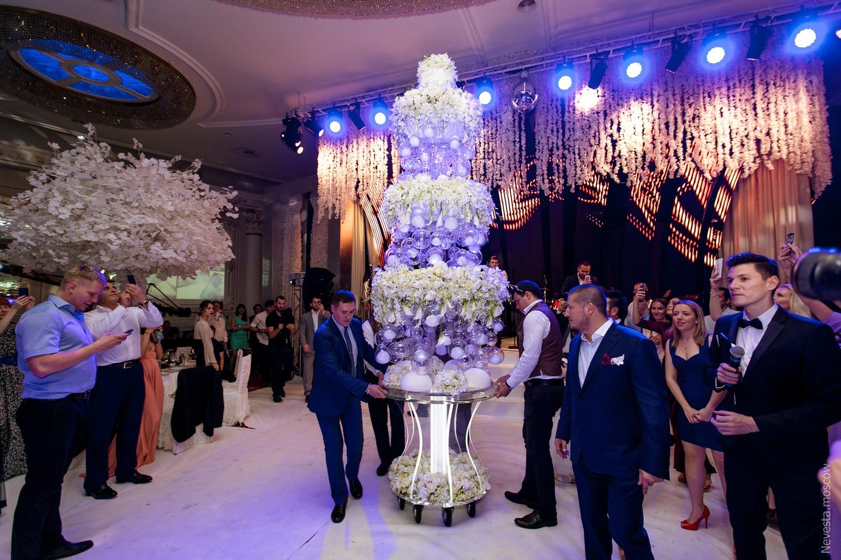 Торт нечто вроде дворца с танцующими статуэтками молодоженов. Изумительно сочетаются цветы на торте и живые цветочные композиции. Архитектурный стиль, колонны, прозрачные элементы делают творение Агзамова космическим
