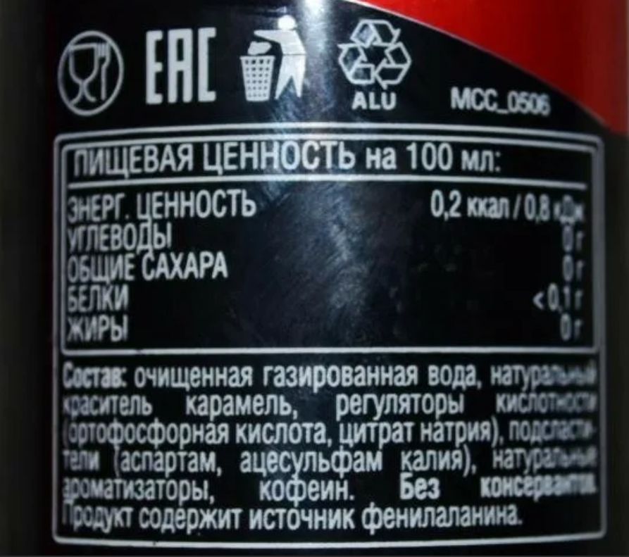 - Зеро. За вкус в этой разновидности отвечает ацесульфам калия. Если выпить 100 г такой Колы, то можно получить энергии на 0,2 ккал;