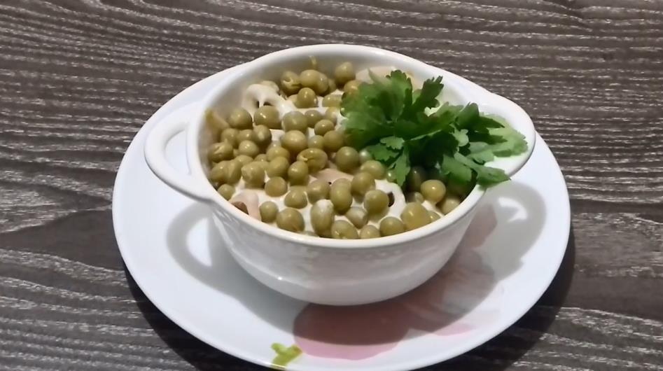 Пикантный салат с кальмарами, яблоком и зеленым горошком