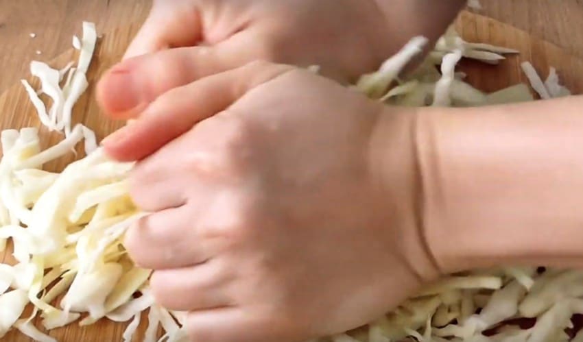 - Капусту необходимо отжать руками от лишней жидкости, которую оставьте в емкости, поскольку она будет использоваться в готовке.