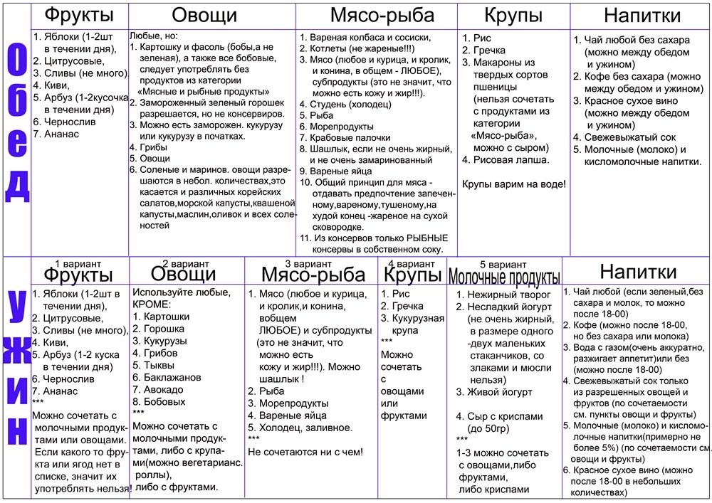 Придерживаясь данной методики похудания очень важно внести временные ограничения в питании и составлять свой рацион только из разрешенных продуктов. До полудня разрешено кушать практически все, но после обеда можно есть только определенные продукты из сочетающихся групп