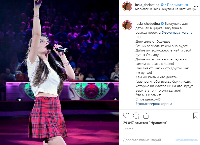 Возрастающая популярность девушки вдохновили ее, и она решилась на новый “cover видео”. После этого, Люся решила постоянно добавлять свое видео в Инстаграм, чтобы все ее поклонники, смогли наслаждаться новыми песнями в ее исполнении. Последние авторские песни Люси: Забудем, Где ты, Ты просто сво, Халява сейчас очень популярны у большого числа поклонников певицы. Девушка постоянно получает, многочисленные положительные отзывы о своей деятельности, и не забывает добавлять новые песни на свой канал. Википедия внесла имя Люси, как блогер и известную российскую певицу, которая завоевала большое число поклонников в стране, благодаря своему таланту и активности. Следуя своим планам, Люси Чеботина планирует стать еще, более популярной певицей и покорить российскую эстраду. Она хочет, чтобы все ее поклонники получали удовольствие, когда слушают ее песни. Певица Люся Чеботина, уже долгое время мечтает спеть с Киркоровым. А сейчас, многие талантливые певцы мечтают спеть дуэтом с Люсей, которая покорила многих людей. Со слов девушки, ее творческий путь, только начался и она планирует добиться высоких результатов и покорить российскую сцену.