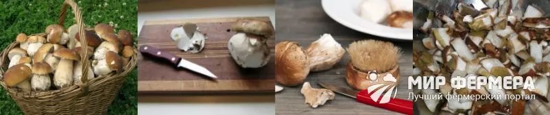 Замачивание помогает естественным путем удалить частички мелкого мусора с труднодоступных мест. После этого нужно удалить всю потемневшую мякоть, а у старых экземпляров следует дополнительно снять тонкую кожицу с ножки. Далее останется только порезать грибы на кусочки нужно размера. Небольшие боровики можно варить целиком (рисунок 1).