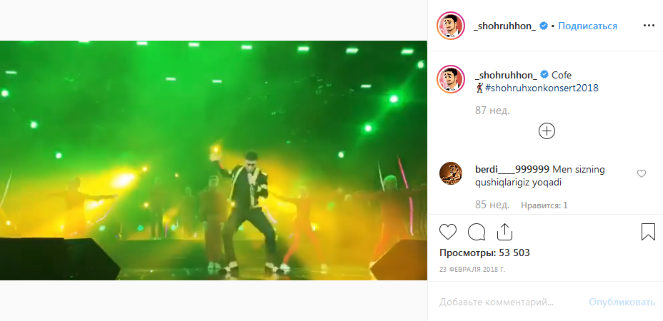 Еще немного про концерты: все мероприятия певца – не просто выступления, а театрализованные представления, где главный герой многократно переодевается, общается с залом, принимает заказы на исполнение любимых публикой хитов. В феврале 2019-го Шохруххон в составе узбекской творческой группы посетил США: в Нью-Йорке с большим успехом прошел концерт артистов республики под названием «50 песен – 50 смеха». А в июне этого года певец приехал с большим концертом в Новосибирск: Новосибирский дворец железнодорожников встретил звезду узбекской эстрады полным залом, российские поклонники «узбекского Ромео» оценили по достоинству его «живые» исполнения известных хитов.