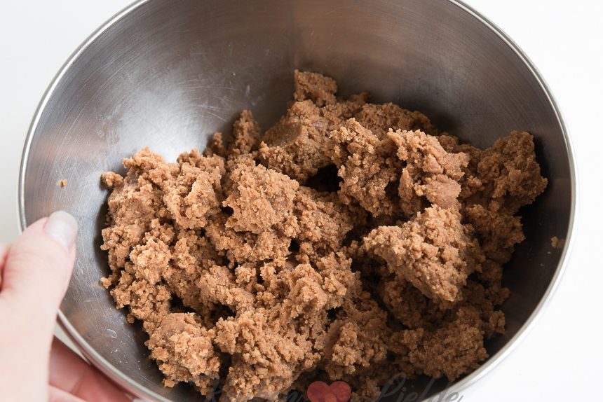 6.Полученную смесь влейте в миску к печенью, вымешайте все руками до образования массы однородной консистенции.