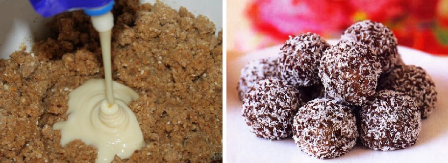 После описанных действий к измельченным пшеничным сухарям добавляют какао. Перемешав сыпучие компоненты, к ним постепенно вливают ранее подготовленную теплую смесь. При этом получают однородную массу шоколадного цвета, которая хорошо поддается лепке. Если смесь рассыпается, то к ней можно добавить еще немного сахарного сиропа.
