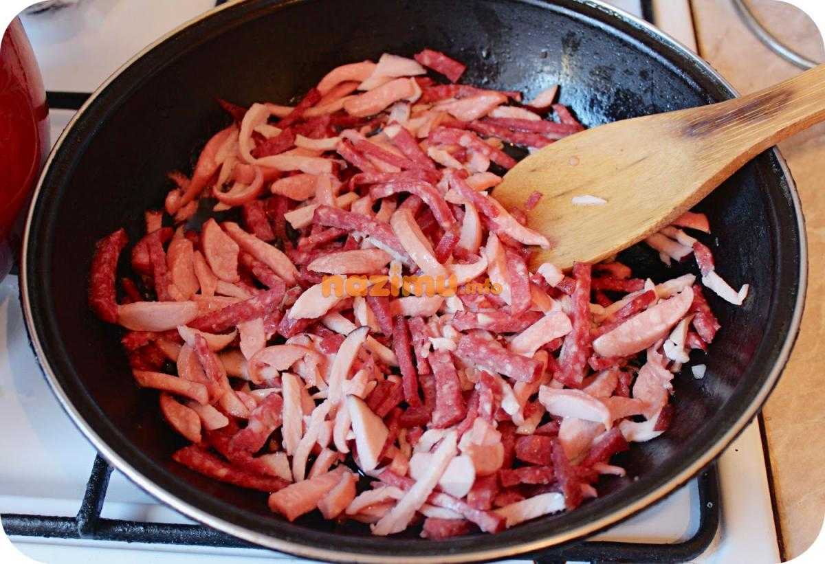 - Колбасу нарезаем длинными полосками или кубиками и сразу отправляем в суп.