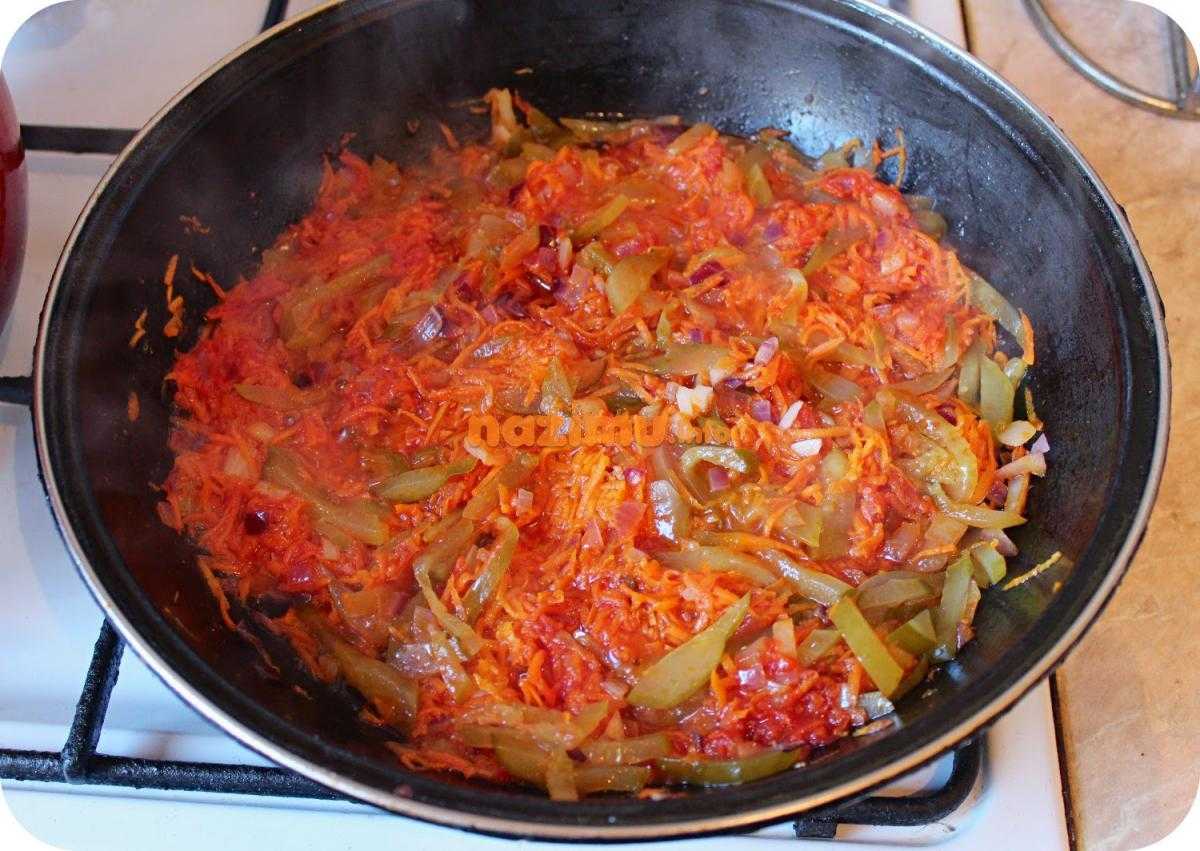 - Помидоры перебиваем блендером и отправляем к остальным овощам. Томим 10 минут на огне, перемешивая ингредиенты. Заправка из овощей готова.