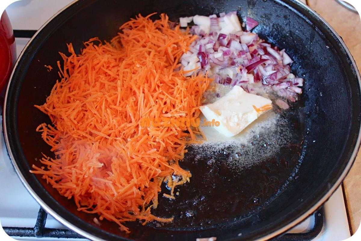 Возьмите репчатый (фиолетовый) лук и освободите его от шелухи. Морковку хорошенько почистите. Вымойте тщательно овощи под проточной водой. Морковь натрите на средней терке, а лук измельчите как можно мельче. После этого в отдельную сковороду добавьте кусочек сливочного масла и поставьте емкость на плиту. Разогрейте и отправьте овощи пассероваться на среднем огне. Готовьте до тех пор, пока морковь не станет мягкой, а лук – прозрачным.
