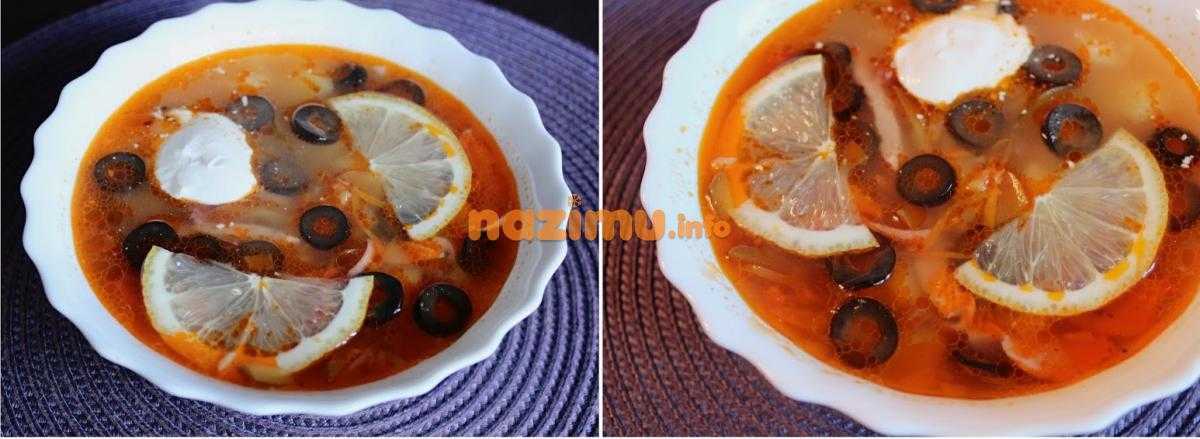 Подавайте блюдо в порционных тарелках с маслинами и лимоном. Кушайте в горячем виде со сметаной и хлебом. Вот и все, классическая вкусная солянка сборная с картошкой готова! Надеемся, что данный пошаговый рецепт с фото был вам полезен и вы осуществили свои кулинарные желания. Приятного аппетита!