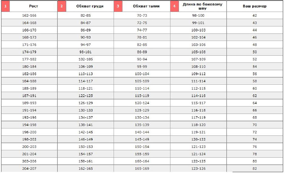 | Рост в см | Вес в кг | Рост в см | Вес в кг | |