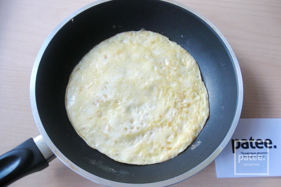 Добавляем яичные блинчики в кастрюлю. Солим и перчим по вкусу.