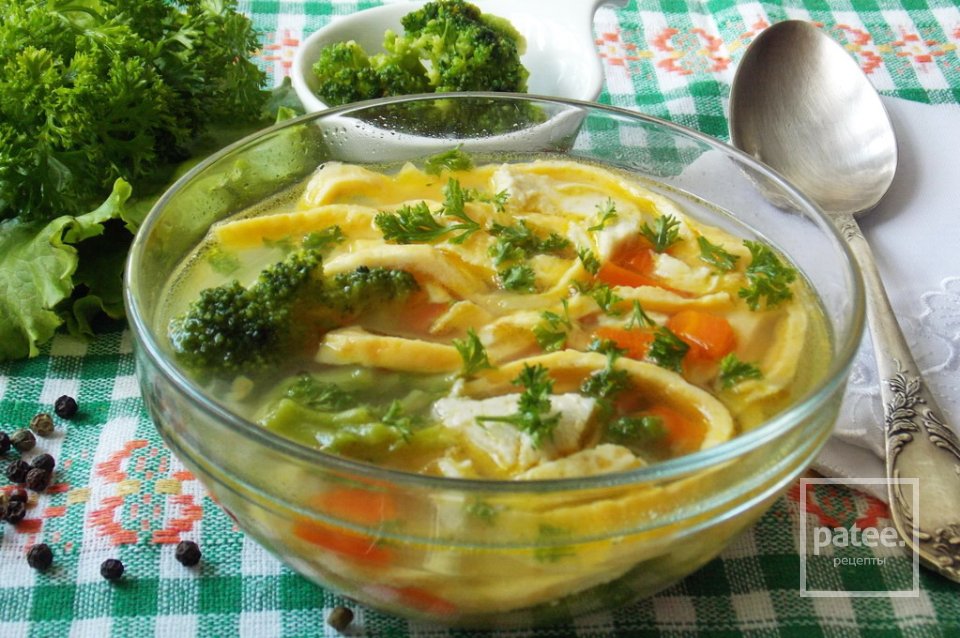 Легкий, нежный суп с брокколи и яичными блинчиками, порезанными соломкой. Абсолютно диетическое блюдо, которое может быть рекомендовано и детям. Процесс приготовления достаточно быстрый и простой. Из филе куриной грудки варится бульон. Из яиц готовятся блинчики, поджаренные на сковороде. В готовый бульон кладут брокколи и варят до готовности десять минут. Яичные блинчики нарезают соломкой, кладут в кастрюлю, добавляют зелень.
