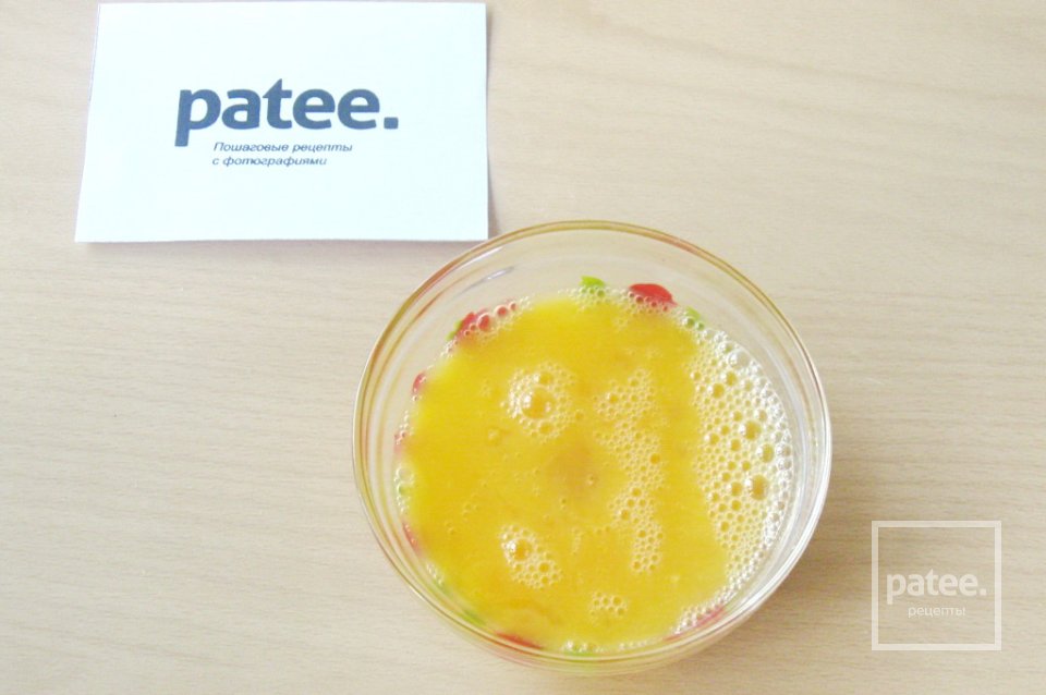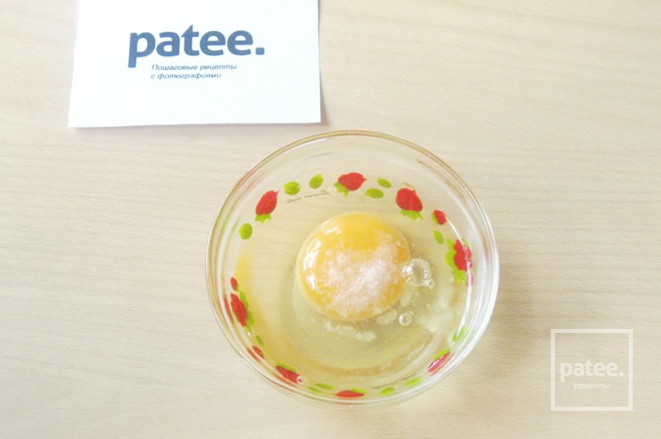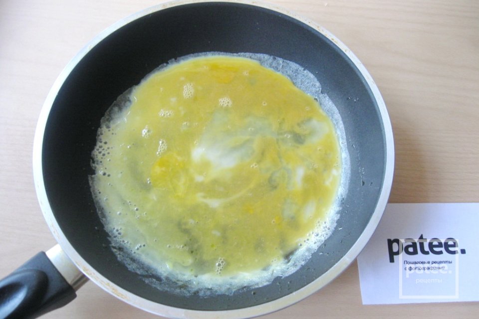 Из четырех яиц по одному печем блинчики. Для этого одно яйцо разбиваем в мисочку, солим.