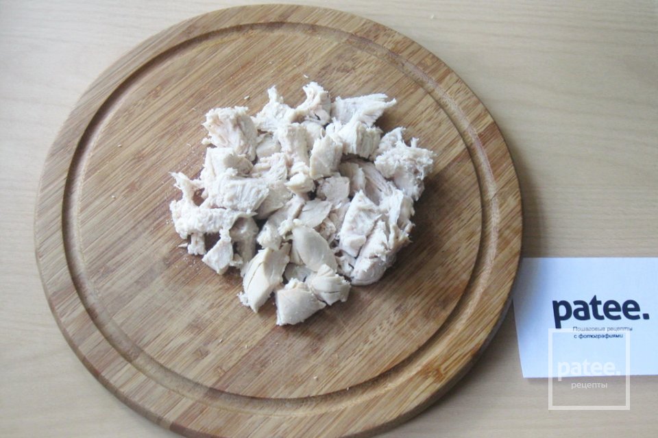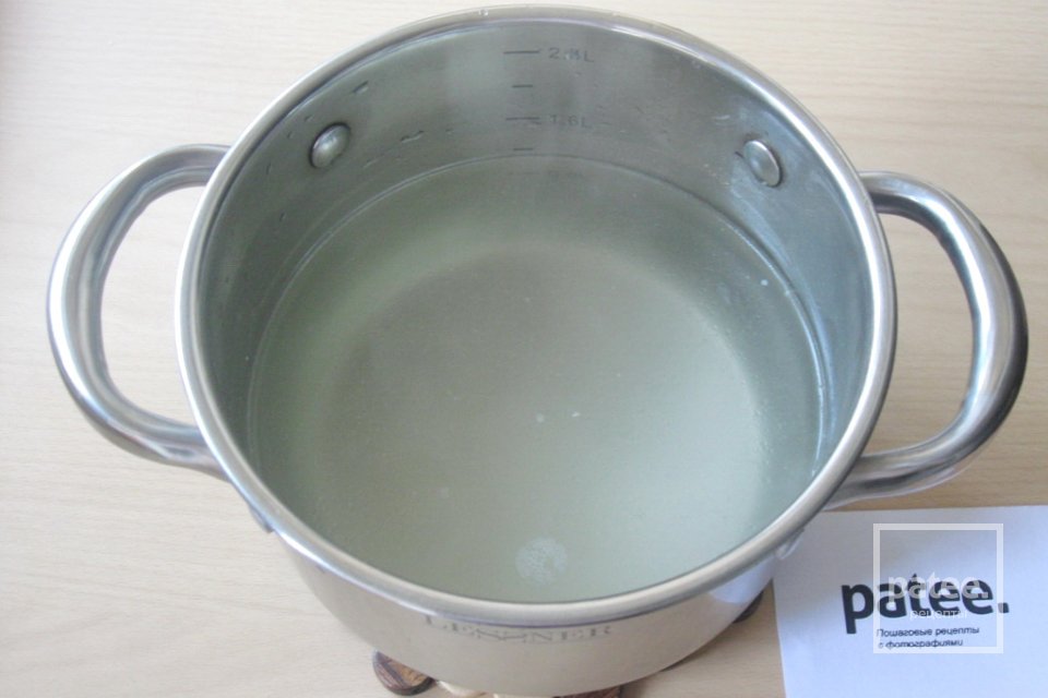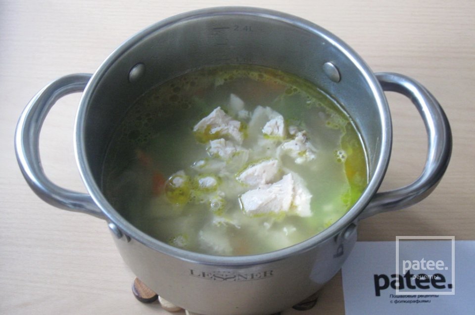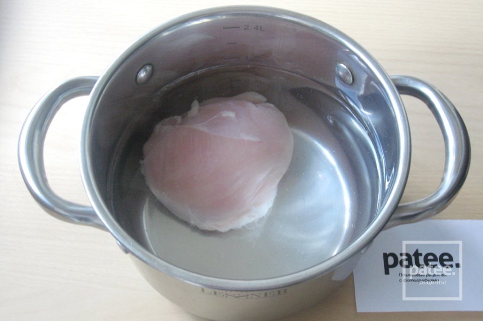 В кастрюлю с водой кладем куриное филе. Ставим на плиту, доводим до кипения. Снимаем пену, уменьшаем огонь и варим до готовности мяса.
