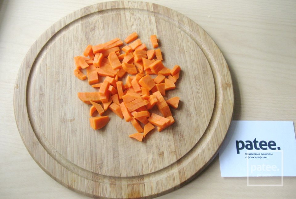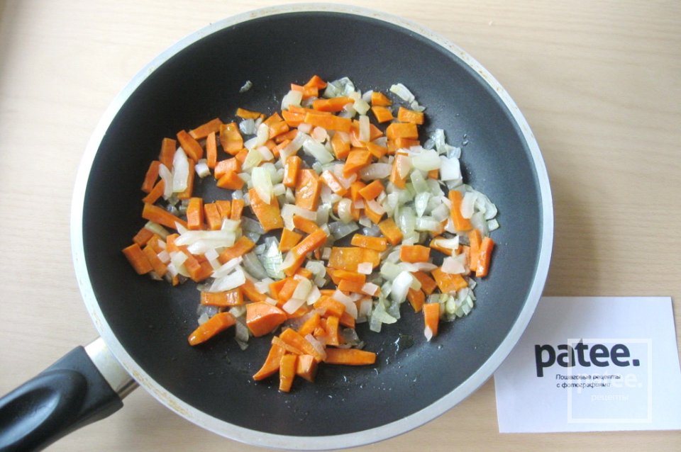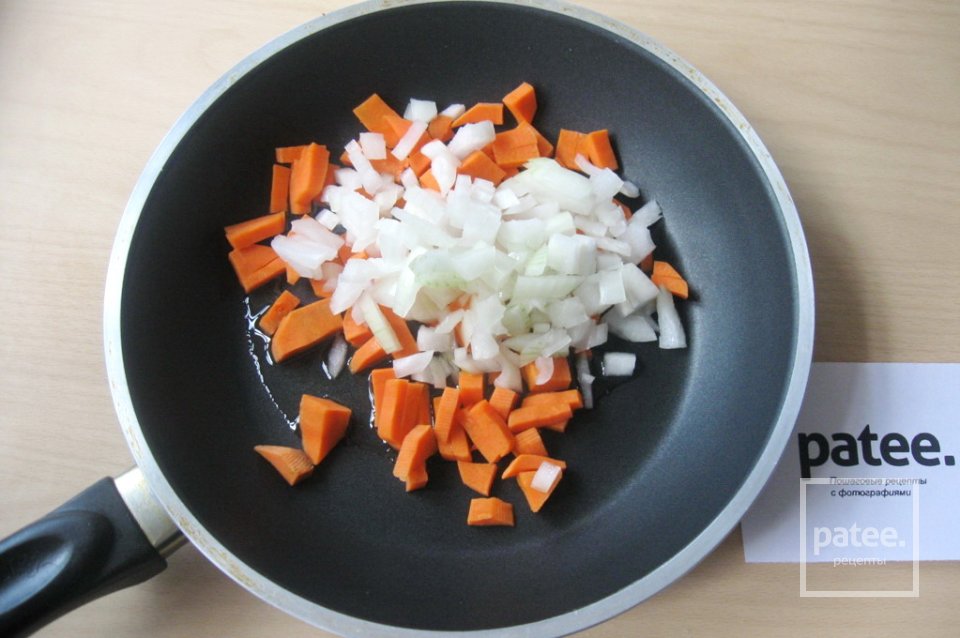 На сковороду наливаем немного подсолнечного масла, кладем морковь и лук.