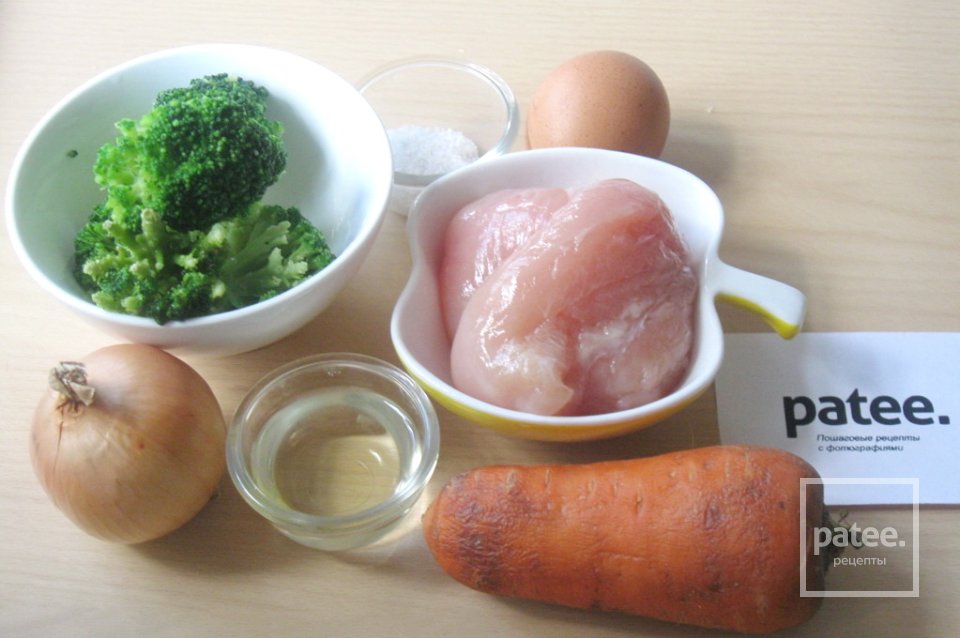 Для приготовления такого супа необходимо взять: филе куриной грудки, яйца, брокколи, морковь, лук репчатый, масло подсолнечное, соль.