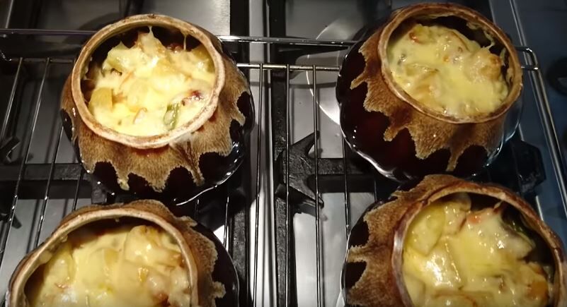 7. Размещаем горшочки в духовке, предварительно не разогревая ее, затем выставляем температуру 200 градусов и запекаем содержимое в течение 50 минут, после чего духовку выключаем, но горшочки оставляем в ней еще на 20 минут, пока духовой шкаф остывает блюдо «дойдет» до идеального вкуса.