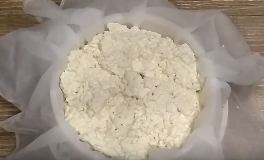 - Переложите массу в двухслойную марлю и оставьте стекать, положив сверху гнет.
