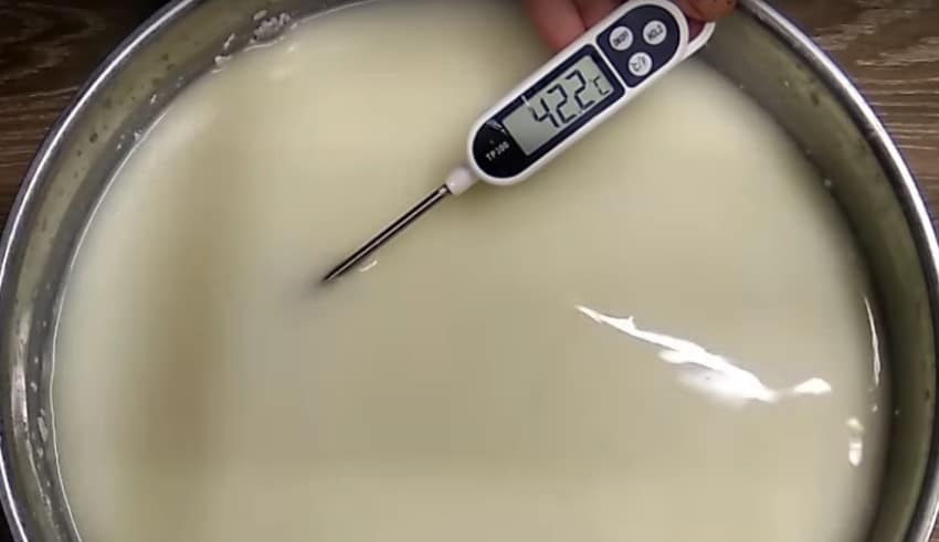 1. Молоко перелейте в 10-литровую кастрюлю и нагрейте его до 32 о С, постоянно помешивая.