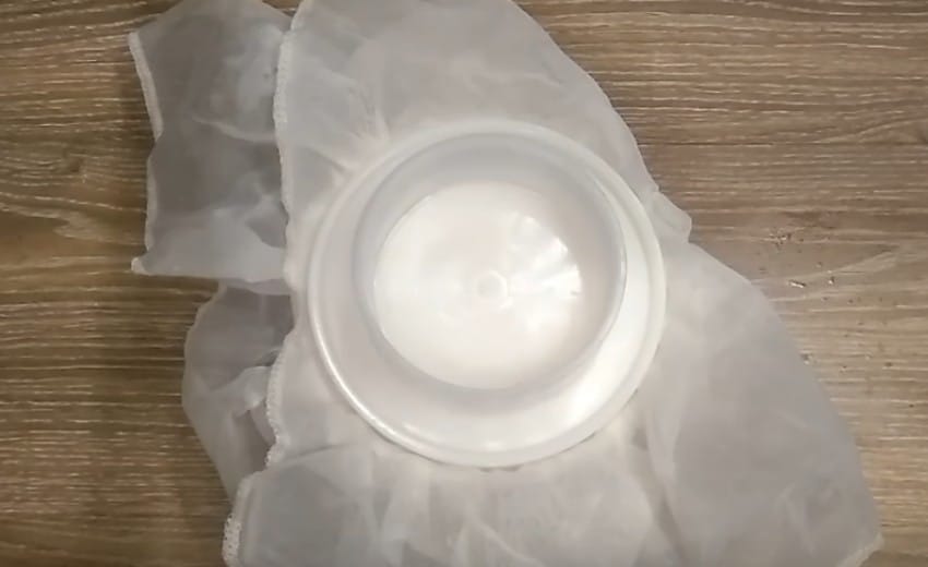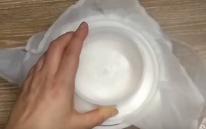 - Чтобы лишняя жидкость стекла, оберните сыр тканью и придавите грузом или подвесьте.