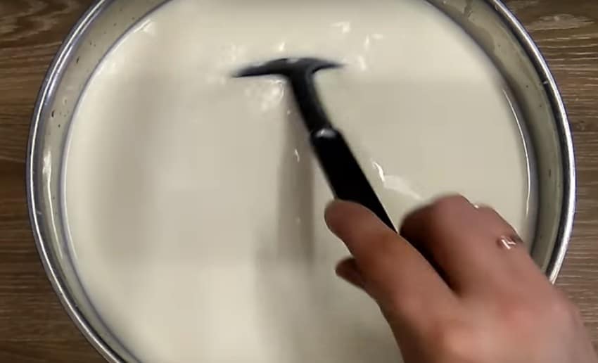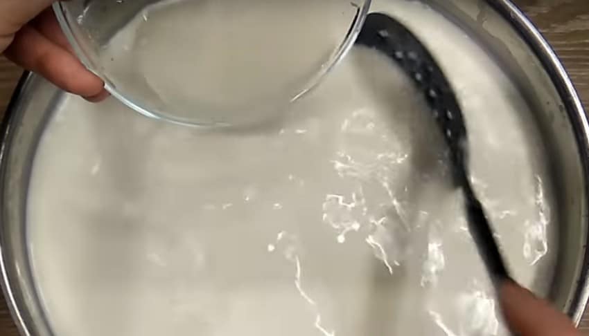 4. Сычужный фермент растворите в 30 мл воды, аккуратно введите его в ёмкость и тщательно перемешайте. Оставьте на 40-60 минут.