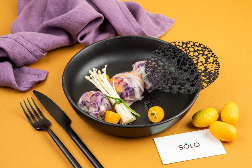Спринг-роллы с маринованными овощами, грибами эноке и соусом «Кочуджан» с веганским сыром в программе питания Solo Vegan