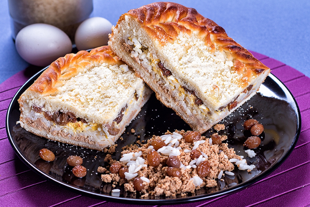 А это уже целый многослойный пирог, готовящийся из риса, яиц, коржа и, конечно, мясного фарша. Волшебный вкус!