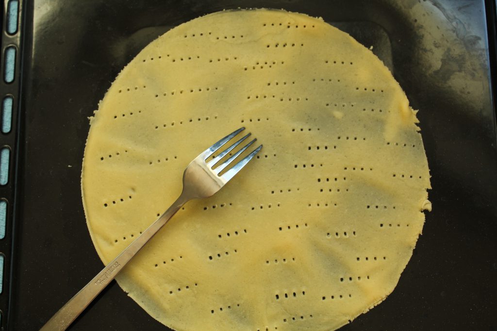 - Выложите тесто на сухой противень, проколите вилкой и отправьте в духовку, на 3-4 минуты, установив 200?C.