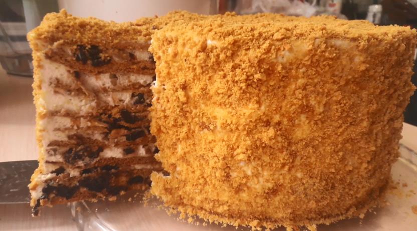 - Обрезки коржей перебейте блендером и крошкой присыпьте поверхность медовика.
