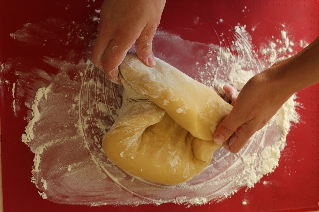 - Снять жидкое тесто с огня, вмешать 2 стакана муки так, чтобы не было комков. Третий стакан высыпать на стол, разровнять и вымесить руками.