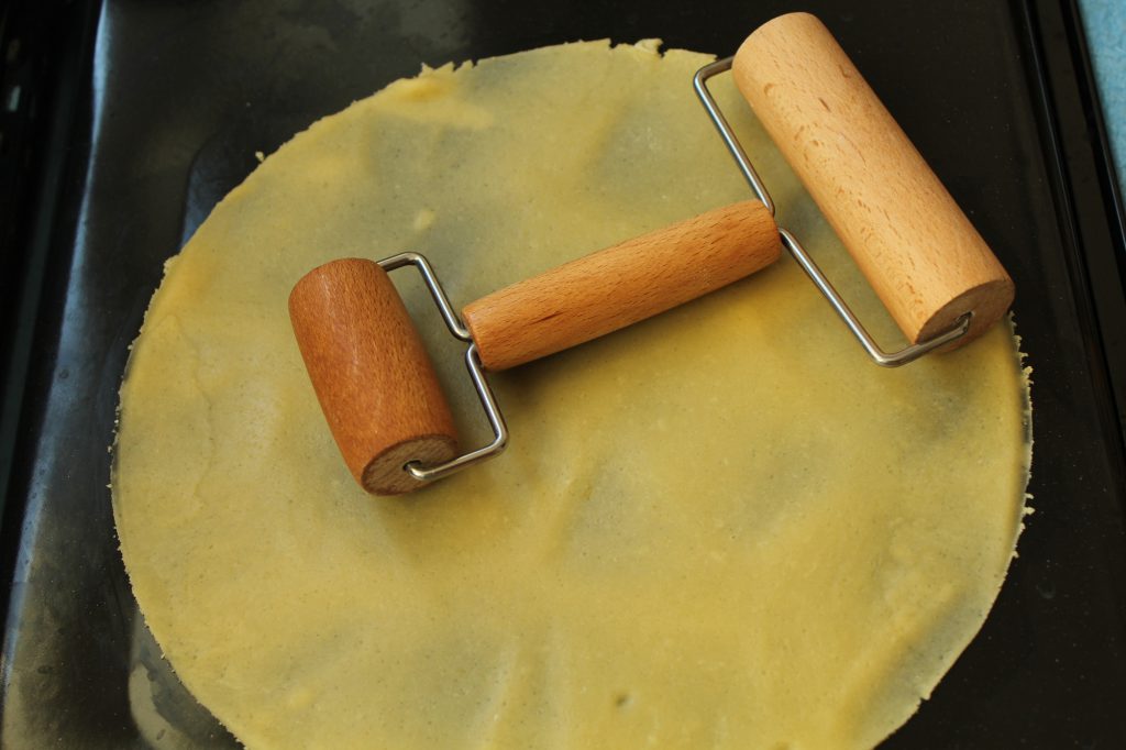 - Каждую часть теста на доске, припорошенной мукой, раскатайте в тонкий пласт.