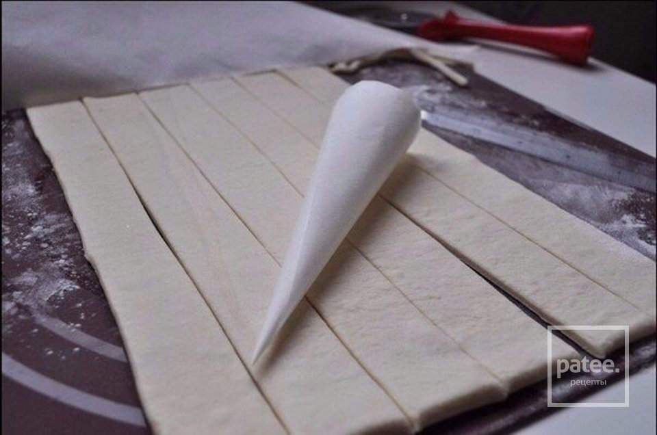1. Каждую пластину слоеного теста раскатать до прямоугольника длиной около 27-30 см.2. Нарезать на длинные полоски толщиной примерно 2,5 см.
