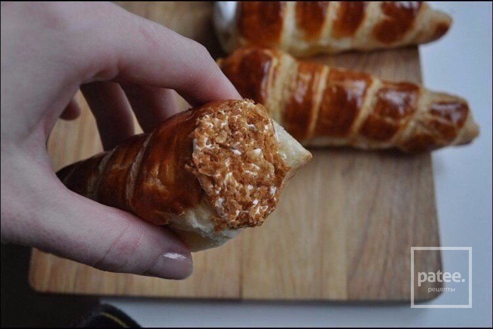 Пропорции теста на одну трубочку остаются такими же, как и в предыдущих рецептах, – столовая ложка. Вареная сгущенка, взбитая вместе с мягким сливочным маслом, станет прекрасным наполнением для такой выпечки.